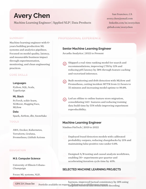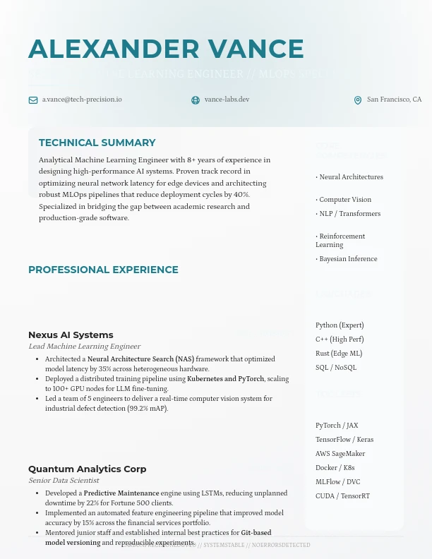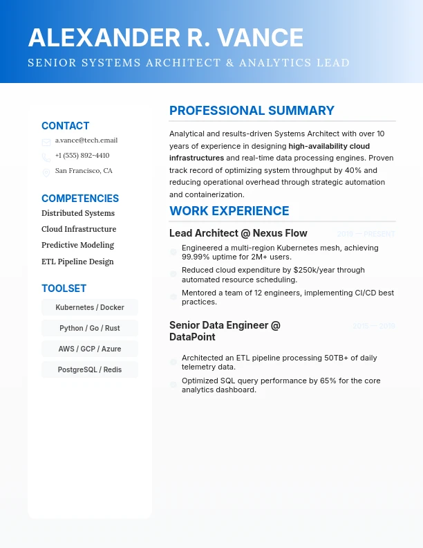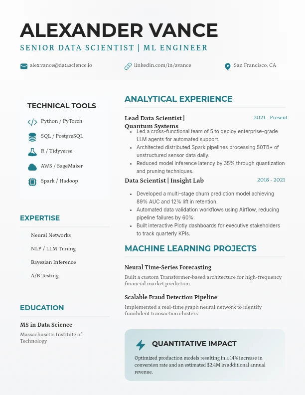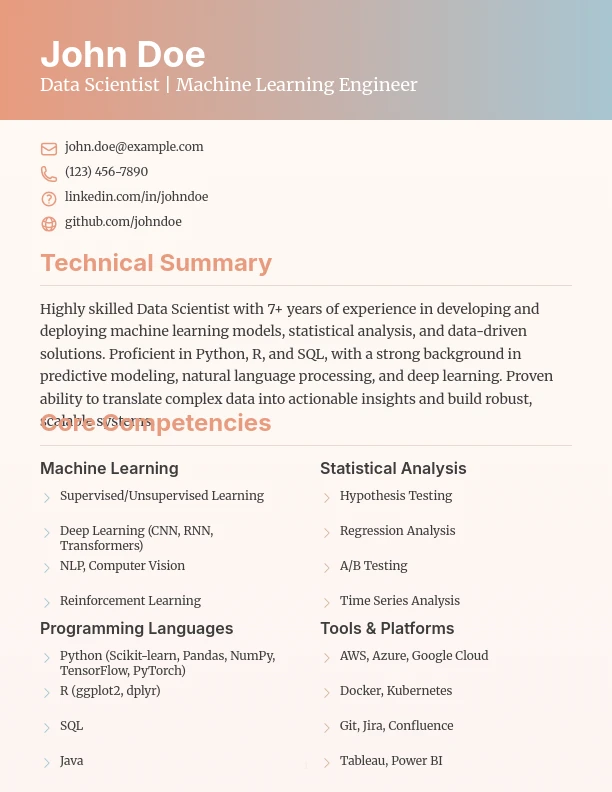 Template Resume Data Scientist kami dirancang khusus untuk menampilkan keahlian dalam analisis statistik, machine learning, dan visualisasi data. Menargetkan profesional yang ingin menonjolkan keahlian teknis seperti Python, R, SQL, dan alat seperti TensorFlow atau Tableau. Sempurna untuk peran di AI, analitik, atau intelijen bisnis, template ini menekankan dampak proyek dan hasil berbasis data. Termasuk bagian untuk sertifikasi, publikasi, dan pencapaian pemecahan masalah kompleks, menghemat waktu dengan format terstruktur dan ramah ATS yang berbeda dari resume teknologi umum.
