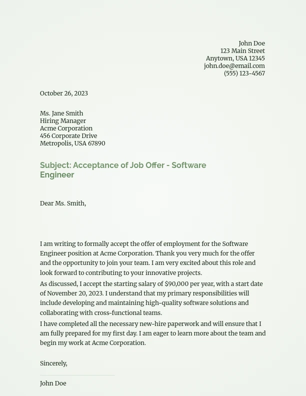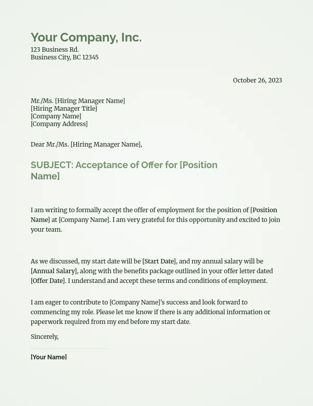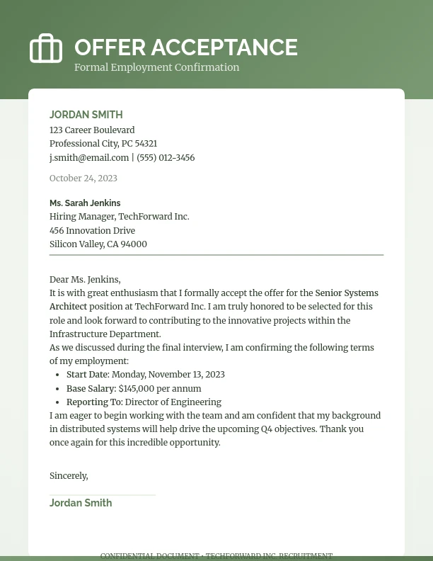 List akceptacyjny to formalny dokument służący do potwierdzenia przyjęcia oferty, zaproszenia lub propozycji. Szablon ten jest idealny dla kandydatów do pracy, studentów lub profesjonalistów odpowiadających na oficjalne oferty. Zawiera kluczowe elementy, takie jak szczegóły oferty, potwierdzenie warunków i uprzejmy ton, aby zachować profesjonalizm. W odróżnieniu od ogólnych listów potwierdzających, listy akceptacyjne wyraźnie potwierdzają zobowiązanie i wdzięczność. Użycie tego szablonu oszczędza czas, oferując ustrukturyzowany format zapewniający jasność i kompletność.