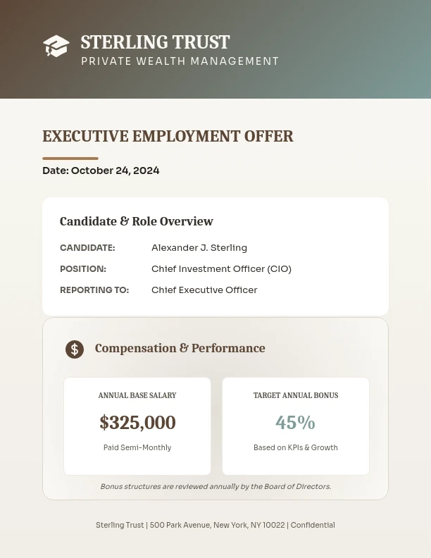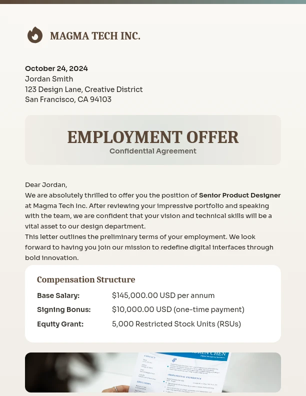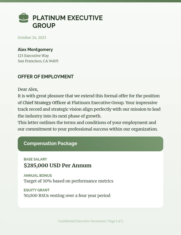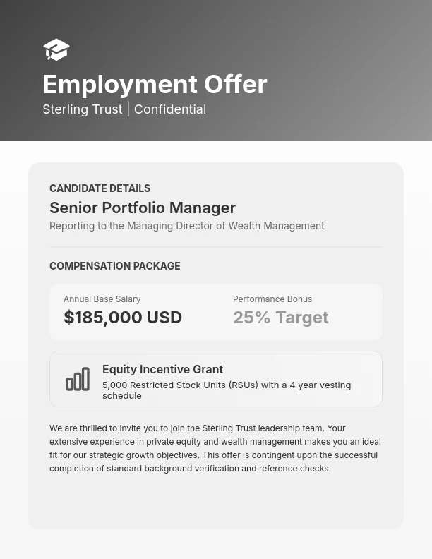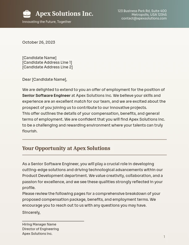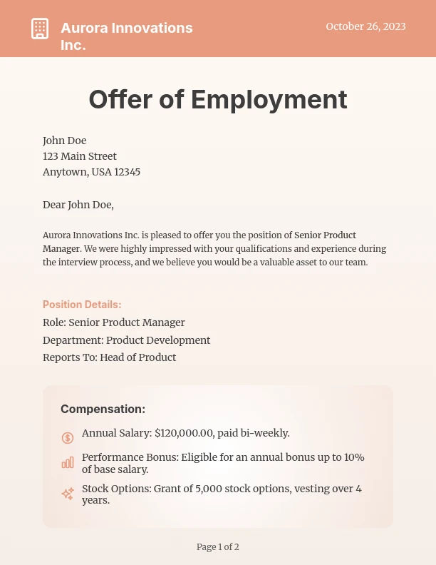 Szablon listu ofertowego jest specjalnie zaprojektowany, aby formalnie przedstawiać oferty zatrudnienia kandydatom, szczegółowo opisując stanowisko, wynagrodzenie, benefity i warunki zatrudnienia. Używany głównie przez HR i menedżerów rekrutacji, zapewnia jasną komunikację i zgodność z prawem. Kluczowe elementy obejmują szczegóły stanowiska, datę rozpoczęcia, wynagrodzenie i instrukcje akceptacji. Ten szablon pomaga zaoszczędzić czas, oferując gotowy, dostosowywalny format, odróżniający go od ogólnych listów biznesowych lub szablonów umów.