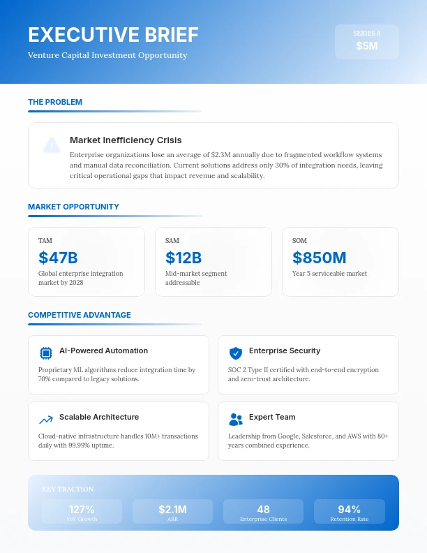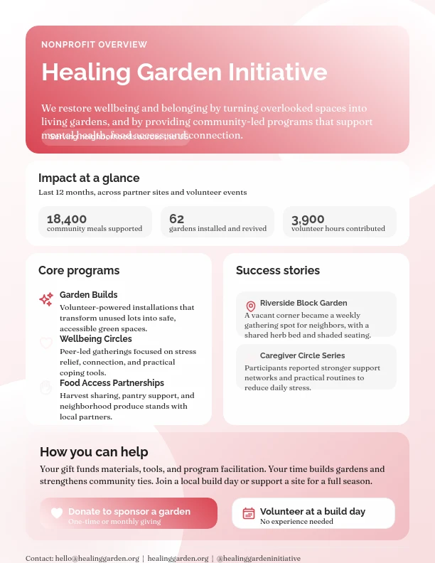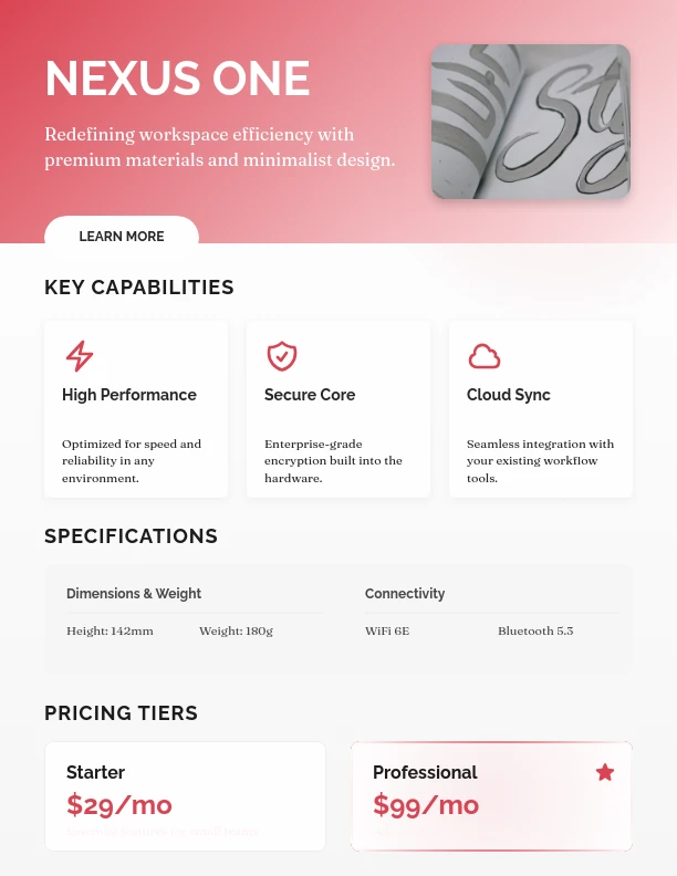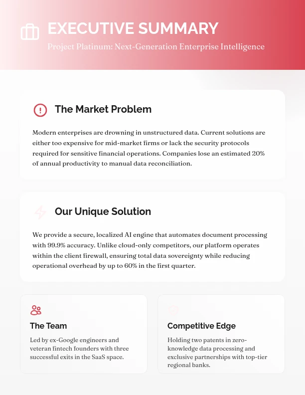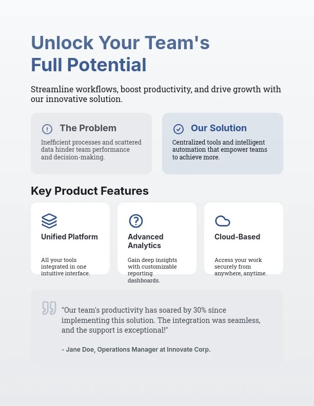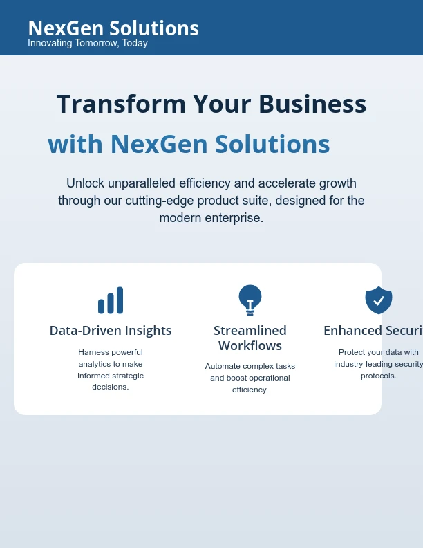 Szablony One Pager oferują zwięzły i wizualnie atrakcyjny sposób na szybkie przedstawienie kluczowych informacji. Idealne dla startupów, marketerów, zespołów sprzedażowych i freelancerów, te szablony pomagają skutecznie komunikować pomysły, produkty lub usługi na jednej stronie. Zawierają konfigurowalne układy, personalizację opartą na AI i łatwą integrację, co usprawnia tworzenie dokumentów i podnosi profesjonalizm. Zastosowania obejmują pitch decki, podsumowania marketingowe, przeglądy produktów i promocje wydarzeń. Z NextDocs tworzenie dopracowanej jednostronicowej prezentacji nigdy nie było tak łatwe i szybkie.