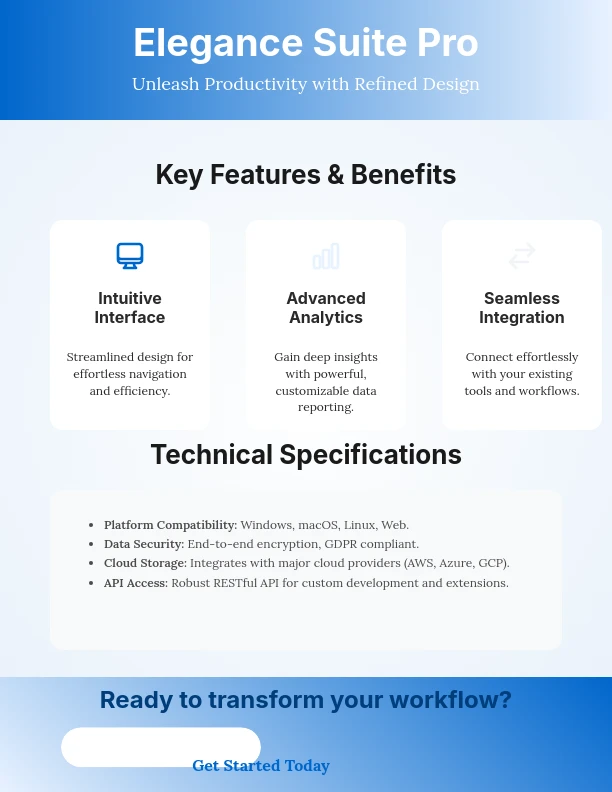 Nasz szablon produktowego one-pagera został zaprojektowany, aby podkreślić kluczowe funkcje, korzyści i wartość Twojego produktu na jednej, łatwej do przyswojenia stronie. Idealny dla startupów, menedżerów produktu i zespołów sprzedażowych, usprawnia komunikację z inwestorami, klientami lub wewnętrznymi interesariuszami. Kluczowe elementy obejmują przegląd produktu, główne funkcje, przypadki użycia i ceny, wszystko ułożone dla maksymalnego efektu. Oszczędzaj czas, korzystając z gotowego układu, który pomaga szybko tworzyć przekonujące historie o produkcie, wyróżniając się spośród wielostronicowych lub nadmiernie szczegółowych dokumentów.