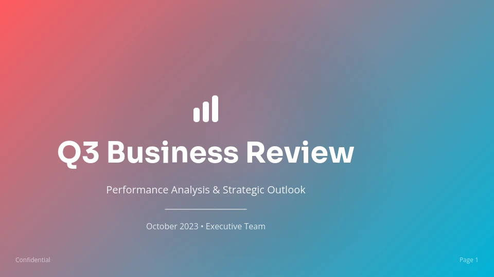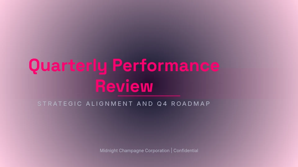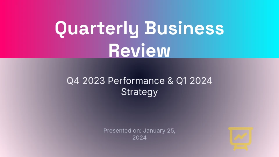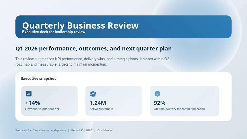 Nasz Szablon prezentacji QBR jest dostosowany specjalnie do kwartalnych przeglądów biznesowych, koncentrując się na wskaźnikach wydajności, celach strategicznych i praktycznych spostrzeżeniach. Idealny dla menedżerów, dyrektorów i zespołów sprzedażowych, podkreśla kluczowe dane biznesowe, śledzenie postępów i analizę możliwości. Zawiera slajdy z aktualizacjami przychodów, opiniami klientów, krajobrazem konkurencyjnym i planami na przyszłość, zapewniając kompleksowy przegląd. Używając tego szablonu, zespoły oszczędzają czas na formatowaniu i mogą skupić się na dostarczaniu wpływowych prezentacji, które napędzają świadome decyzje. W odróżnieniu od ogólnych szablonów, ten jest strukturalnie dostosowany do rytmów kwartalnych i zaangażowania interesariuszy.