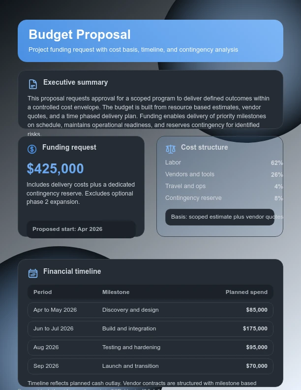 Szablon oferty budżetowej jest specjalnie zaprojektowany, aby opisać plany finansowe i szacunkowe koszty projektów lub inicjatyw. W odróżnieniu od ogólnych propozycji, skupia się na jasnym rozbiciu budżetu, uzasadnieniach wydatków i wnioskach o finansowanie. Idealny dla menedżerów projektów, właścicieli firm i specjalistów finansowych, zapewnia kluczowe elementy, takie jak szczegółowe koszty, harmonogramy i alokacja zasobów. Użycie tego szablonu oszczędza czas, oferując ustrukturyzowany format, który upraszcza złożone szczegóły budżetowe, pomagając szybciej uzyskać zatwierdzenia i utrzymać przejrzystość finansową.