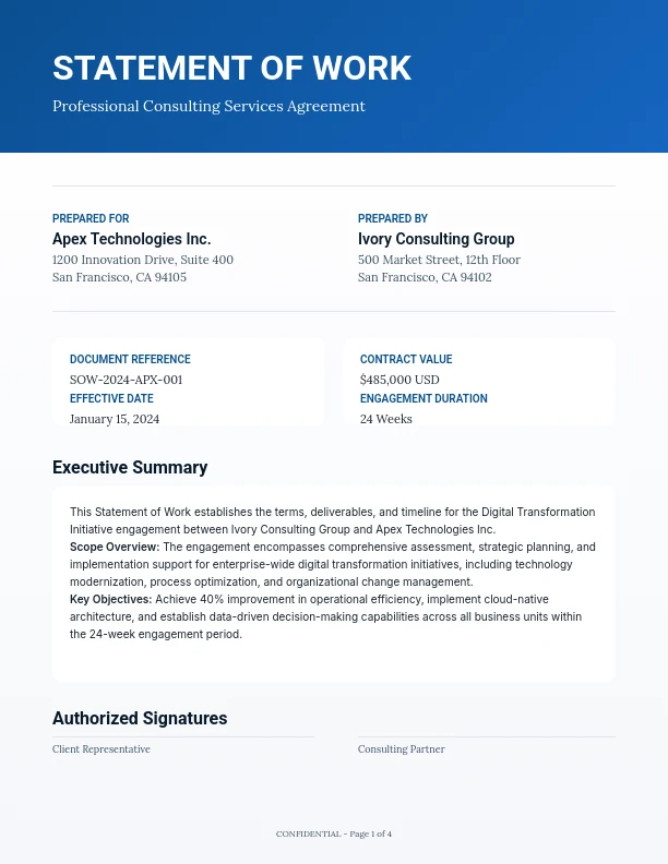 Nasz szablon Consulting Sow jest specjalnie zaprojektowany dla usług doradczych, szczegółowo opisując zakres projektu, rezultaty, terminy i obowiązki klienta. W odróżnieniu od ogólnych szablonów SOW, ten uwzględnia unikalny charakter pracy konsultingowej, takiej jak usługi doradcze, planowanie strategiczne i rekomendacje ekspertów. Idealny dla konsultantów i firm konsultingowych, pomaga jasno określić oczekiwania i ograniczyć niejasności projektu. Kluczowe elementy obejmują definicję zakresu, kamienie milowe, warunki płatności i klauzule poufności, dostosowane do projektów konsultingowych. Użycie tego szablonu pozwala zaoszczędzić czas, oferując gotową, prawnie sprawdzoną ramę, która minimalizuje negocjacje i ryzyko zgodności.