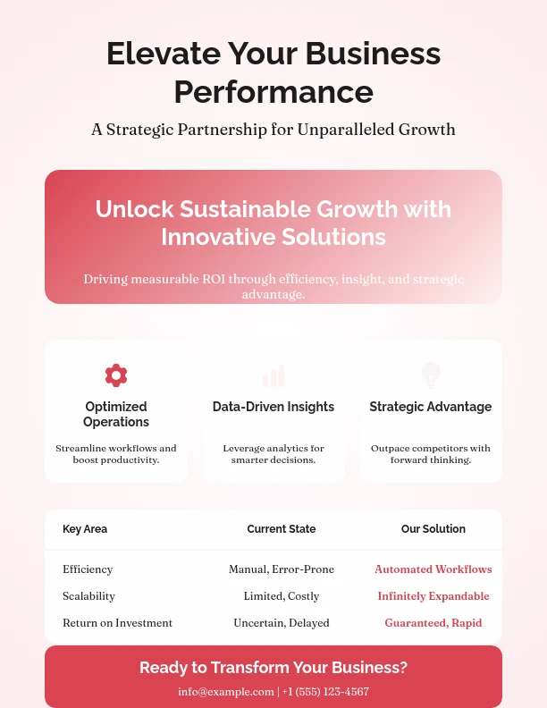 เทมเพลตหน้าเดียวสำหรับฝ่ายขายของเราออกแบบมาเพื่อเน้นจุดขายหลักของผลิตภัณฑ์หรือบริการของคุณในรูปแบบที่สั้น กระชับ และดึงดูดสายตา เหมาะสำหรับมืออาชีพด้านการขาย สตาร์ทอัพ และทีมการตลาด ซึ่งเน้นองค์ประกอบสำคัญ เช่น ข้อเสนอคุณค่า ราคา ประโยชน์ต่อผู้ใช้ และคำกระตุ้นให้ดำเนินการ แตกต่างจากหน้าเดียวทั่วไปที่เน้นข้อความการขาย ช่วยให้การสื่อสารการขายเป็นไปอย่างรวดเร็วและง่ายดาย ประหยัดเวลาโดยใช้โครงสร้างที่พร้อมใช้งานและสมดุลระหว่างเนื้อหาที่โน้มน้าวใจและการออกแบบที่สะอาดตา เหมาะสำหรับการนำเสนอ การติดตามผล และการสร้างโอกาส