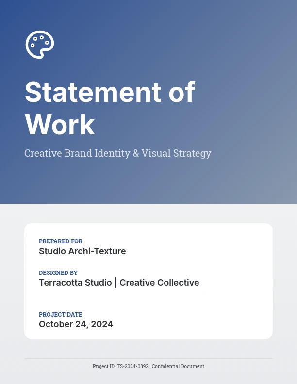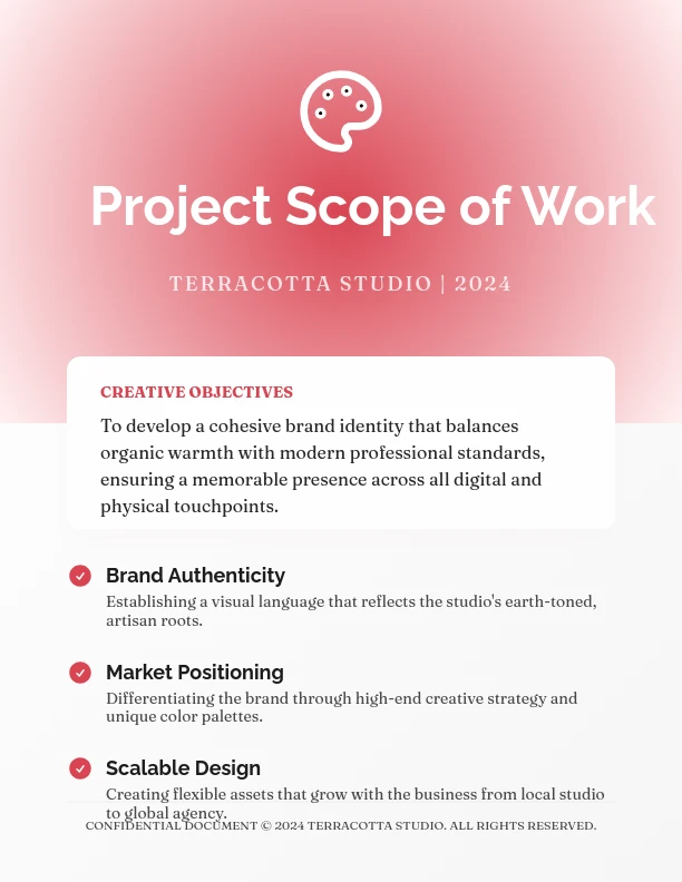 เทมเพลต Design Sow นี้ออกแบบมาเพื่อโครงการสร้างสรรค์ โดยระบุรายละเอียดของผลลัพธ์การออกแบบ จุดสำคัญ และความคาดหวังของลูกค้า ซึ่งเหมาะสำหรับนักออกแบบ เอเจนซี และฟรีแลนซ์ เพื่อให้การสื่อสารชัดเจนและลดความเสี่ยงของการขยายขอบเขต ส่วนประกอบสำคัญได้แก่ วัตถุประสงค์ของโครงการ บทบาท เวลาที่กำหนด และกระบวนการอนุมัติ ซึ่งปรับให้เหมาะสมกับเวิร์กโฟลว์ด้านการออกแบบ เทมเพลตนี้ช่วยประหยัดเวลาโดยให้โครงสร้างที่แตกต่างจากขอบเขตโครงการทั่วไป ช่วยให้เริ่มต้นโครงการได้รวดเร็วและทำงานร่วมกับลูกค้าได้ราบรื่น