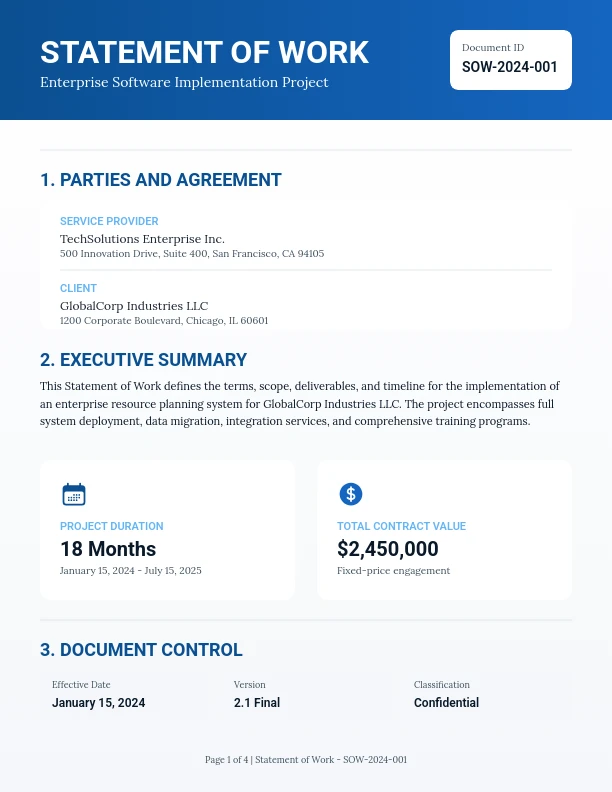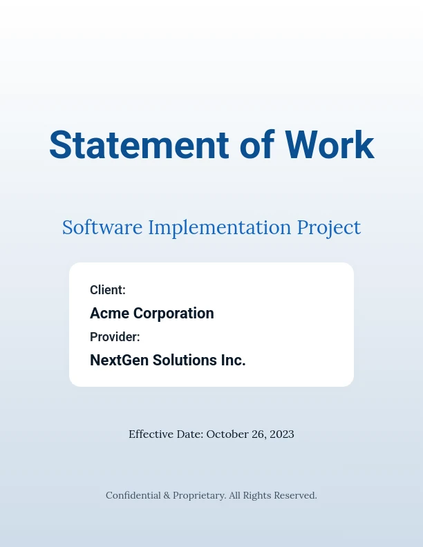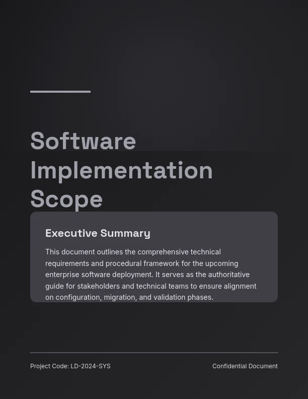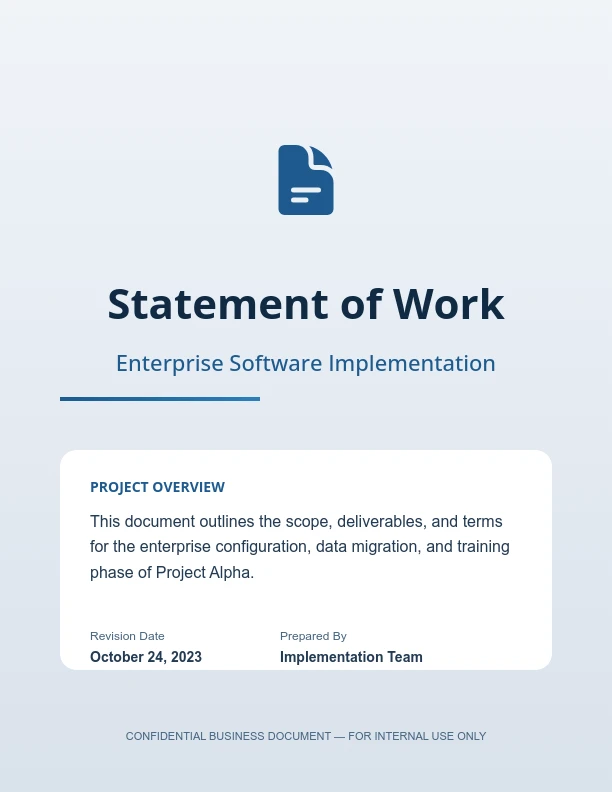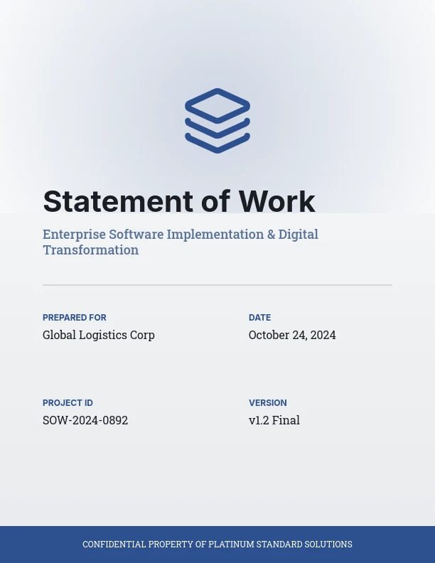 เทมเพลต Statement of Work (Sow) สำหรับการติดตั้งซอฟต์แวร์นี้ออกแบบมาเพื่อกำหนดขอบเขต โครงงาน ผลงานสำเร็จ และเวลาที่เฉพาะเจาะจงสำหรับโครงการติดตั้งซอฟต์แวร์ เหมาะสำหรับผู้ให้บริการไอที ผู้จัดการโครงการ และผู้ขายซอฟต์แวร์ เทมเพลตนี้ช่วยให้ชัดเจนในบทบาท ความรับผิดชอบ และข้อกำหนดทางเทคนิค รวมถึงองค์ประกอบสำคัญ เช่น การตั้งค่าระบบ จุดเชื่อมต่อ การทดสอบ และแผนสนับสนุน ซึ่งแตกต่างจาก SOW ทั่วไป การใช้เทมเพลตนี้ช่วยประหยัดเวลาในการจัดทำเอกสาร ลดความเสี่ยงของการขยายขอบเขต และเสริมสร้างการสื่อสารกับผู้มีส่วนได้ส่วนเสียตลอดวงจรชีวิตของการติดตั้งซอฟต์แวร์