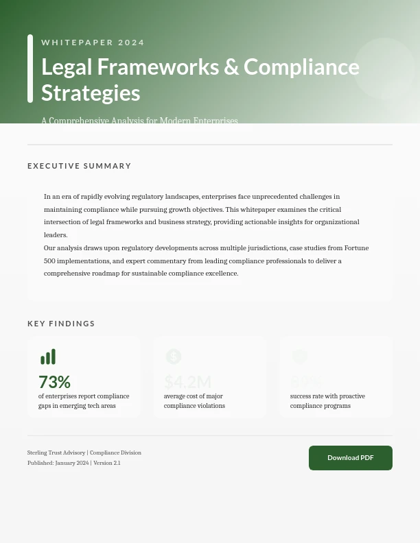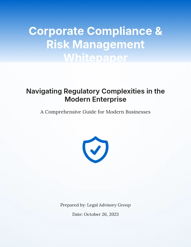 เทมเพลต Whitepaper กฎหมายของเราออกแบบมาโดยเฉพาะเพื่อรองรับหัวข้อทางกฎหมายที่ซับซ้อนด้วยความชัดเจนและความน่าเชื่อถือ เหมาะสำหรับสำนักงานกฎหมาย ที่ปรึกษาทางกฎหมาย และทีมกฎหมายองค์กร เทมเพลตนี้ช่วยให้การสร้าง Whitepapers รายละเอียดที่อธิบายกฎระเบียบ กรณีศึกษา หรือโครงสร้างทางกฎหมายเป็นไปอย่างรวดเร็วและเป็นระบบ รวมถึงส่วนสำหรับสรุปผู้บริหาร การวิเคราะห์ทางกฎหมาย คำแนะนำด้านการปฏิบัติตามกฎระเบียบ และเอกสารอ้างอิง เพื่อความครอบคลุมของเนื้อหา โดยใช้เทมเพลตนี้มืออาชีพด้านกฎหมายจะประหยัดเวลาในการจัดรูปแบบและโครงสร้าง ทำให้สามารถเน้นเนื้อหาที่แม่นยำและโน้มน้าวใจ แตกต่างจาก Whitepapers ทั่วไปที่เน้นศัพท์ทางกฎหมายและมาตรฐานการปฏิบัติตามกฎระเบียบ จึงเป็นเครื่องมือที่สมบูรณ์แบบสำหรับความต้องการด้านเอกสารทางกฎหมาย