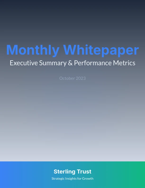 เทมเพลต Whitepaper รายเดือนของเราออกแบบมาโดยเฉพาะสำหรับองค์กรที่ต้องรายงานแนวโน้ม ข้อมูลเชิงลึก และข้อมูลในแต่ละเดือน เทมเพลตนี้เน้นการให้ข้อมูลอัปเดตตามเวลาที่เหมาะสมเพื่อให้ผู้มีส่วนได้ส่วนเสียรับรู้ความคืบหน้าอย่างต่อเนื่อง เหมาะสำหรับทีมการตลาด นักวิเคราะห์ และผู้เชี่ยวชาญในอุตสาหกรรม รวมถึงส่วนสำคัญ เช่น สรุปผู้บริหาร การวิเคราะห์ข้อมูล และคำแนะนำที่สามารถดำเนินการได้ เทมเพลตนี้ช่วยให้การสร้างเนื้อหาเป็นไปอย่างรวดเร็วและรักษาความสม่ำเสมอและความเป็นมืออาชีพในรายงานแต่ละฉบับ