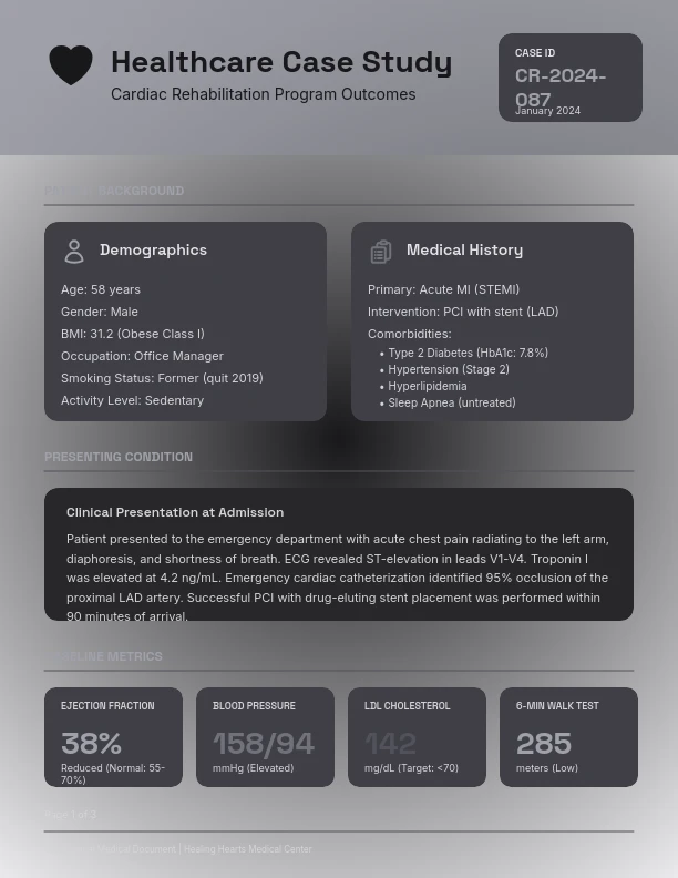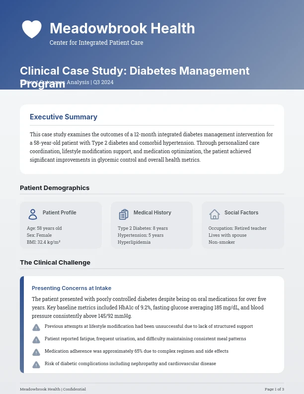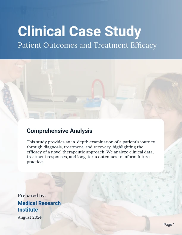 Sağlık Hizmetleri Vaka Çalışması Şablonumuz, tıbbi profesyoneller, klinikler ve sağlık kuruluşları için hastaların tedavi sonuçlarını ve klinik başarı hikayelerini belgelemek ve sunmak amacıyla özel olarak tasarlanmıştır. Hasta geçmişi, tanı, tedavi planları ve ölçülebilir sonuçlar gibi ana unsurları içerir; sağlık standartlarına uygunluğu sağlar. Tıbbi müdahalelerin etkinliğini, araştırma bulgularını veya sağlık yeniliklerini göstermek için idealdir. Bu şablon, sağlık ekiplerinin zamanını formatlama yerine doğru ve etkili hikaye anlatımına odaklanmasını sağlar, genel iş veya akademik raporlardan farklıdır.