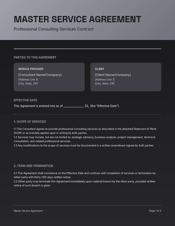 Ana Hizmet Sözleşmesi (Msa) şablonları, devam eden hizmet ilişkilerini yöneten işletmeler için temel araçlardır. Bu şablonlar net şartlar sağlar, müzakere süresini azaltır ve yasal uyumu garanti eder. Hizmet sağlayıcılar, hukuk ekipleri ve proje yöneticileri tarafından yaygın şekilde kullanılır. NextDocs’un Msa şablonları, yapay zeka özelleştirmesi ile kullanıcıların anlaşmaları belirli projelere veya müşterilere hızlıca uyarlamasına olanak tanır. BT hizmetleri, danışmanlık ve dış kaynak sözleşmeleri için idealdir, şablonlarımız sözleşme iş akışlarını kolaylaştırır ve riskleri en aza indirir.