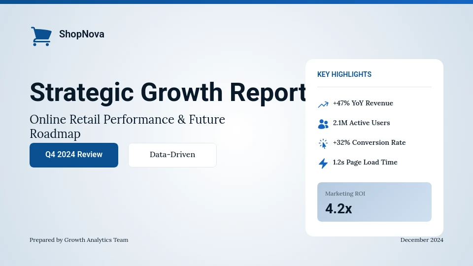 Mẫu Nghiên Cứu Trường Hợp Thương Mại Điện Tử của chúng tôi được thiết kế để thể hiện các thách thức và thành công đặc thù của các doanh nghiệp bán lẻ trực tuyến. Nó có các phần phân tích hành vi khách hàng, tối ưu hóa phễu bán hàng và tác động của chiến dịch marketing. Phù hợp cho các quản lý thương mại điện tử, nhà tiếp thị và tư vấn, mẫu này giúp minh họa tăng trưởng đo lường được và ROI. Với các yếu tố tùy chỉnh sẵn có, giúp tiết kiệm thời gian trong khi truyền đạt câu chuyện rõ ràng, hấp dẫn, phân biệt các nghiên cứu của bạn so với các mẫu B2B hoặc dịch vụ truyền thống.