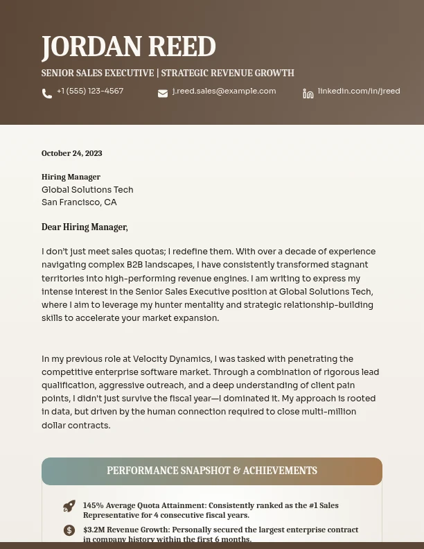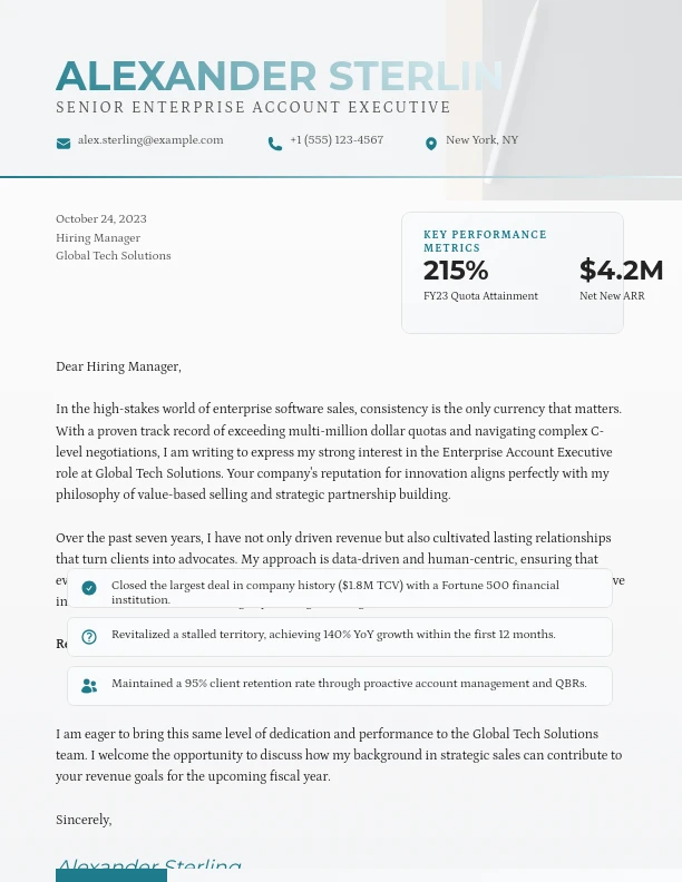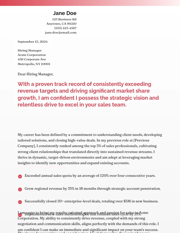 Mẫu Thư Xin Việc Bán Hàng của chúng tôi được thiết kế đặc biệt cho các chuyên gia bán hàng muốn thể hiện khả năng giao tiếp thuyết phục và xây dựng mối quan hệ. Phù hợp cho các vai trò bán lẻ, B2B và quản lý tài khoản, mẫu này làm nổi bật thành tích bán hàng chính và phương pháp lấy khách hàng làm trung tâm. Bao gồm các phần thể hiện khả năng đạt chỉ tiêu, kỹ năng đàm phán và chiến lược tìm kiếm khách hàng tiềm năng. Sử dụng mẫu này giúp bạn tiết kiệm thời gian với định dạng có cấu trúc, gây ấn tượng mạnh mẽ và khác biệt so với các thư chung chung.