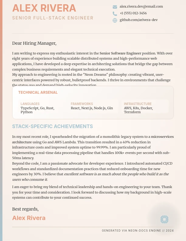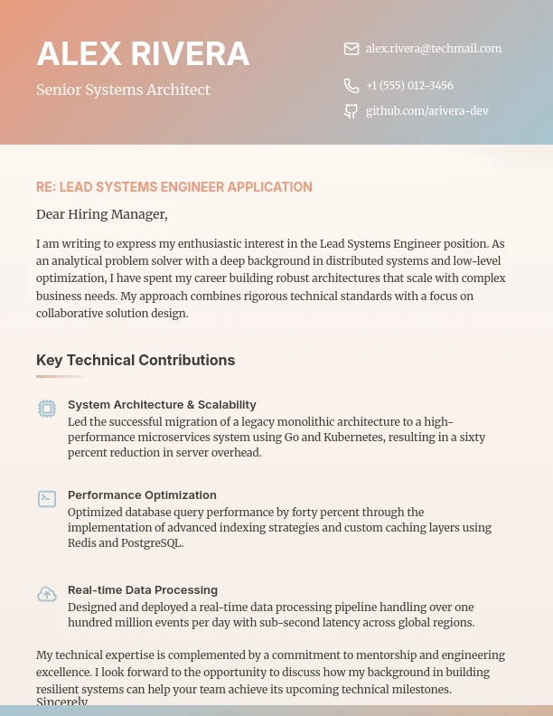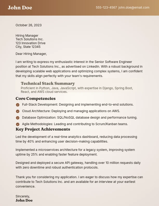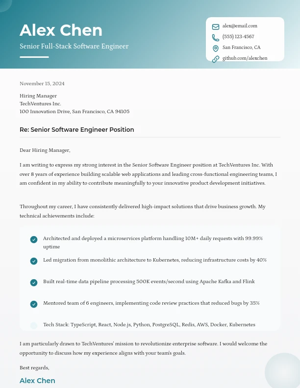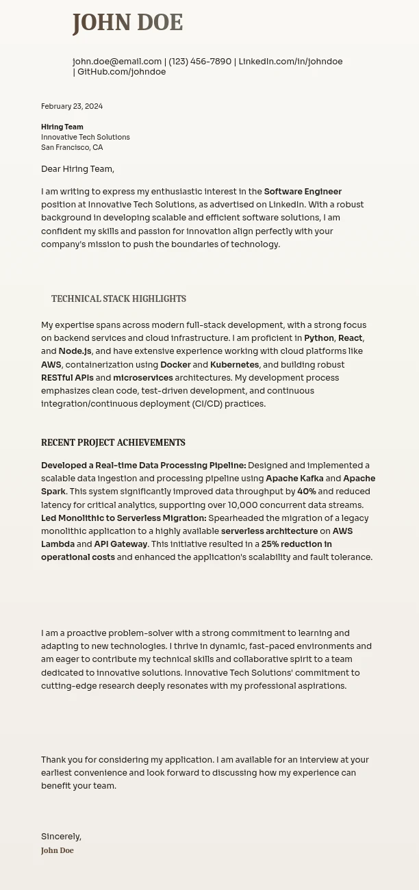Mẫu Thư Xin Việc Kỹ Sư Phần Mềm của chúng tôi được thiết kế đặc biệt cho các chuyên gia công nghệ ứng tuyển vào các vị trí phát triển phần mềm. Nó tập trung vào việc thể hiện chuyên môn kỹ thuật, kinh nghiệm dự án và khả năng giải quyết vấn đề—những yếu tố quan trọng mà nhà tuyển dụng tìm kiếm. Phù hợp cho các nhà phát triển phần mềm, lập trình viên và kỹ sư mong muốn nổi bật trong thị trường việc làm cạnh tranh. Mẫu này giúp bạn tiết kiệm thời gian bằng cách cung cấp định dạng rõ ràng, có cấu trúc, làm nổi bật kỹ năng lập trình và thành tích phù hợp của bạn. Khác với thư xin việc chung chung, nó nhắm vào các đặc điểm của kỹ thuật phần mềm để giúp bạn gây ấn tượng mạnh.