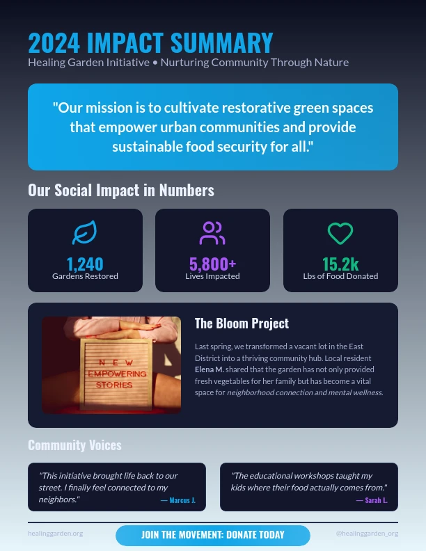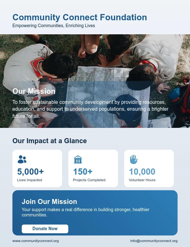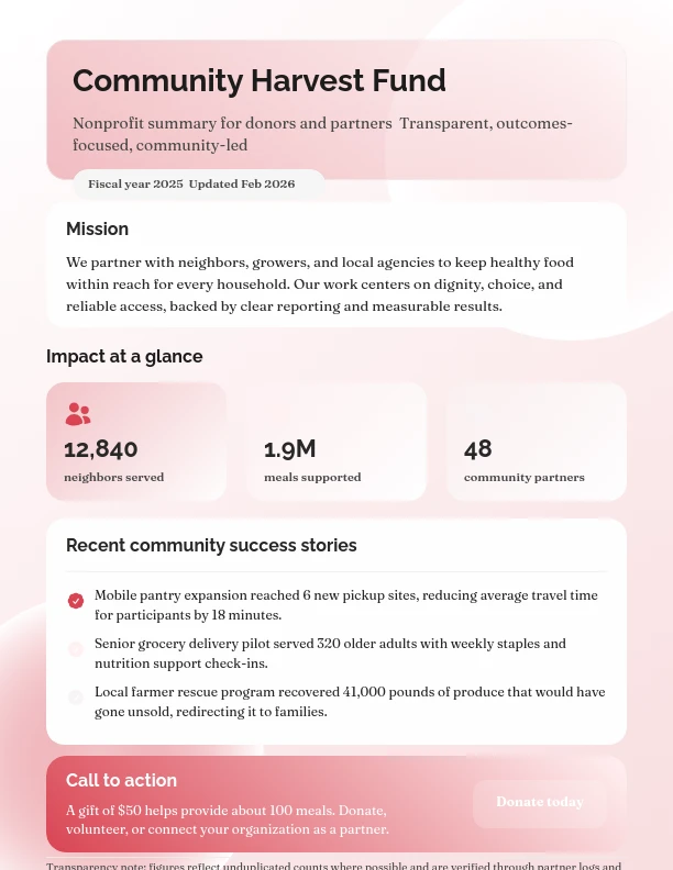 Mẫu Trang Một Phi Lợi Nhuận của chúng tôi đặc biệt thiết kế để trình bày rõ ràng sứ mệnh, tác động và mục tiêu gây quỹ của tổ chức bạn. Phù hợp cho các tổ chức phi lợi nhuận, từ thiện và xã hội, nó bao gồm các yếu tố chính như tuyên bố sứ mệnh, điểm nổi bật nhà tài trợ, tổng quan chương trình và phần kêu gọi hành động. Mẫu này giúp tiết kiệm thời gian bằng cách cung cấp bố cục sẵn sàng tập trung vào kể chuyện và tương tác, phân biệt với các trang chung chung bằng cách nhấn mạnh tác động xã hội và giao tiếp với nhà tài trợ. Hoàn hảo cho các đơn xin tài trợ, chiến dịch và trình bày các bên liên quan.