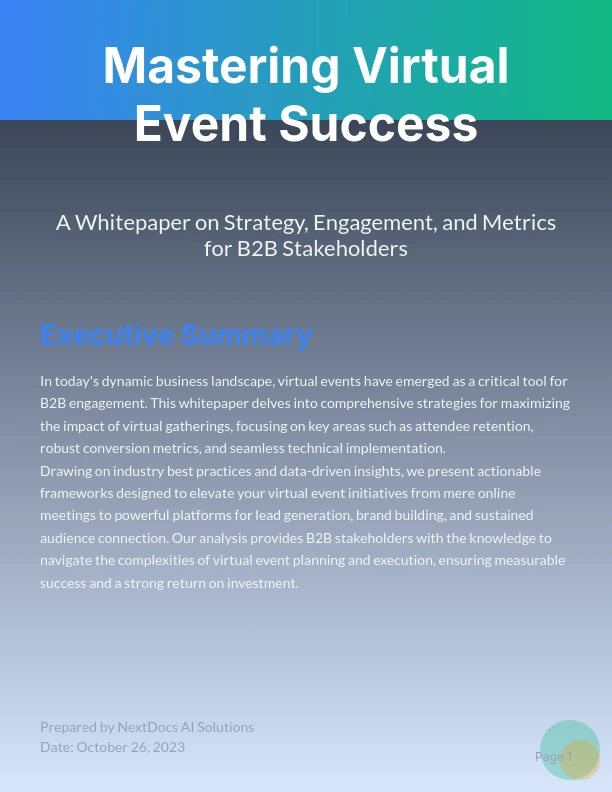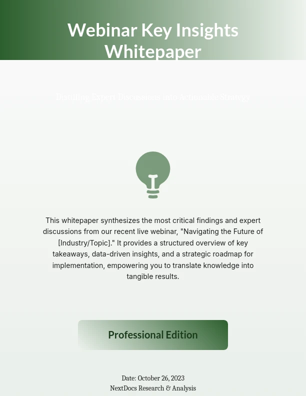 Mẫu Whitepaper Hội Thảo Trực Tuyến của chúng tôi được thiết kế đặc biệt để nắm bắt toàn bộ giá trị của các hội thảo trực tuyến của bạn bằng cách chi tiết các thông tin chính, phản hồi của người tham dự và các điểm hành động có thể thực hiện. Khác với whitepapers chung, mẫu này tập trung vào tóm tắt nội dung sự kiện trực tiếp, lý tưởng cho các marketer, nhà giáo dục và nhóm bán hàng muốn chuyển đổi nội dung hội thảo thành tài sản tạo khách hàng tiềm năng. Nó bao gồm các phần dành cho điểm nổi bật của diễn giả, các chỉ số tương tác của khán giả và chiến lược theo dõi, giúp bạn tiết kiệm thời gian trong khi tạo ra các tài liệu chuyên nghiệp, có tác động. Sử dụng mẫu này để biến các hội thảo của bạn thành các tác phẩm lãnh đạo tư tưởng mạnh mẽ thúc đẩy chuyển đổi.